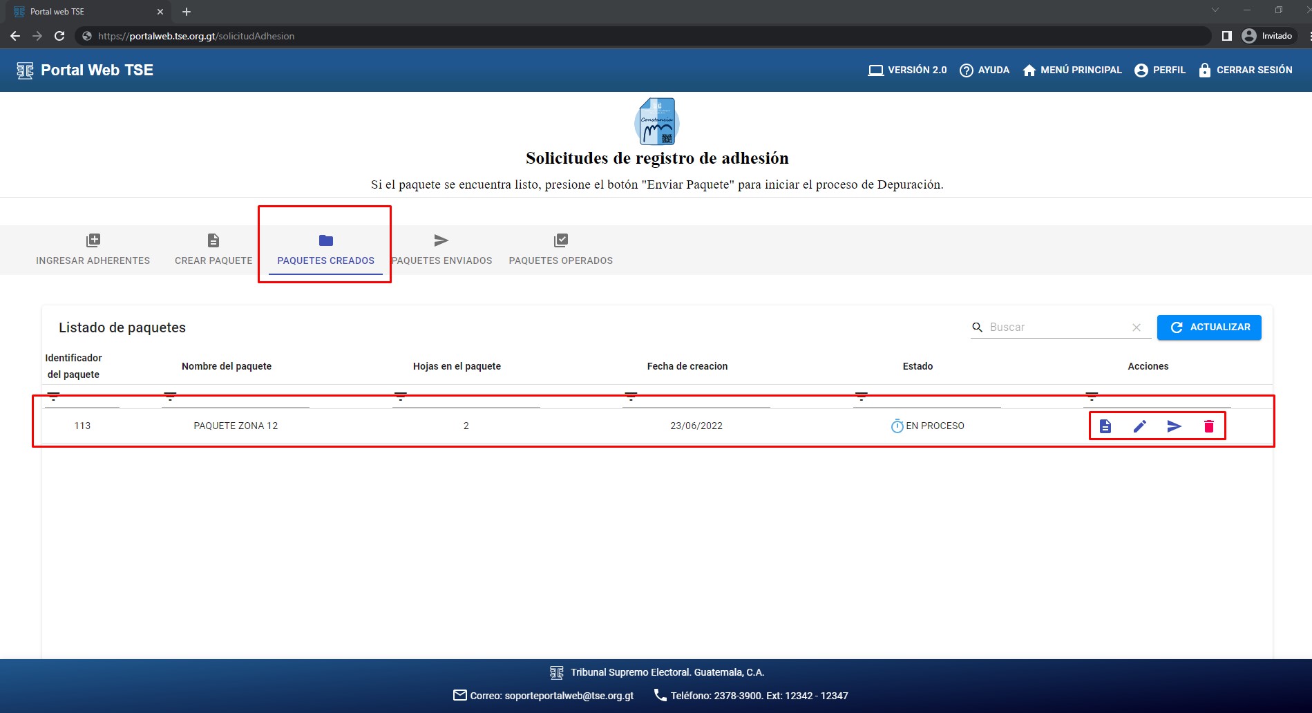 En la siguiente pestaña “PAQUETES CREADOS” se desplegara el listado de paquetes que hayan sido creados, con diferentes acciones para los paquetes.