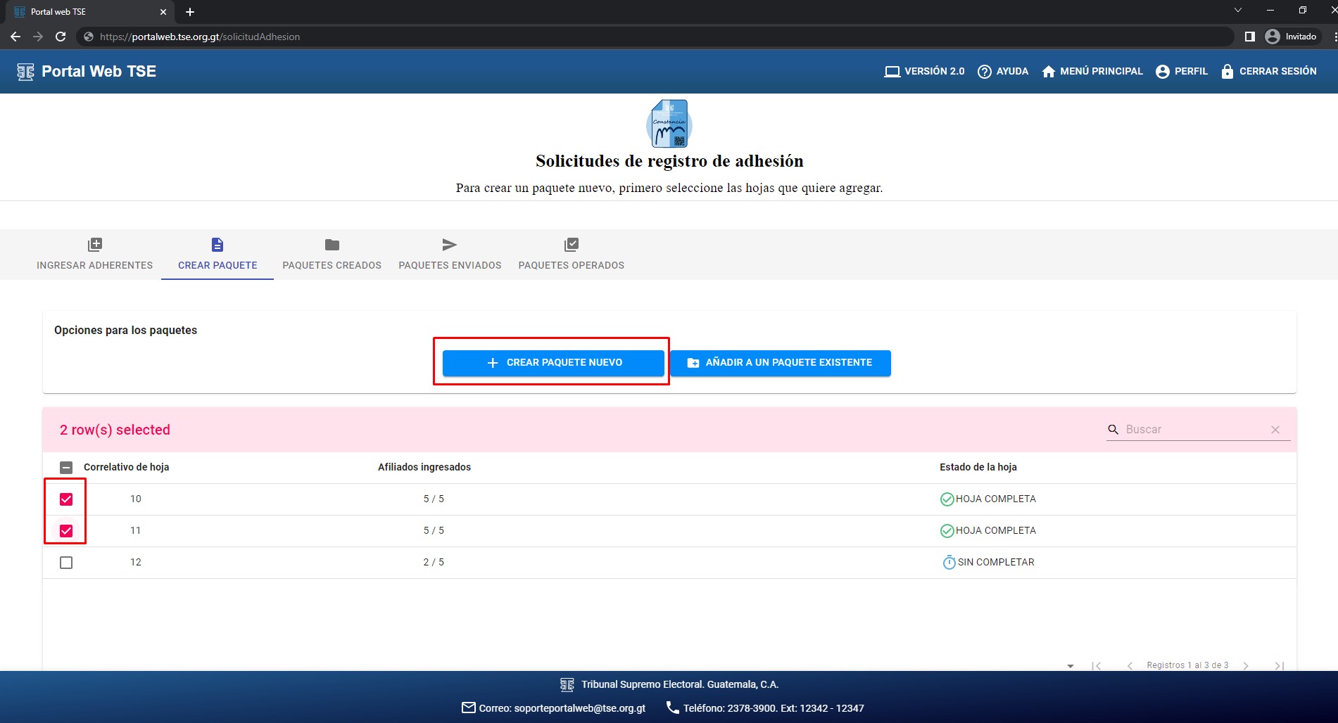 Cuando los paquetes (Folder) físicos estén armados debe seleccionar las mismas hojas en el sistema y elegir entre “CREAR PAQUETE NUEVO" o “AÑADIR A UN PAQUETE EXISTENTE” .