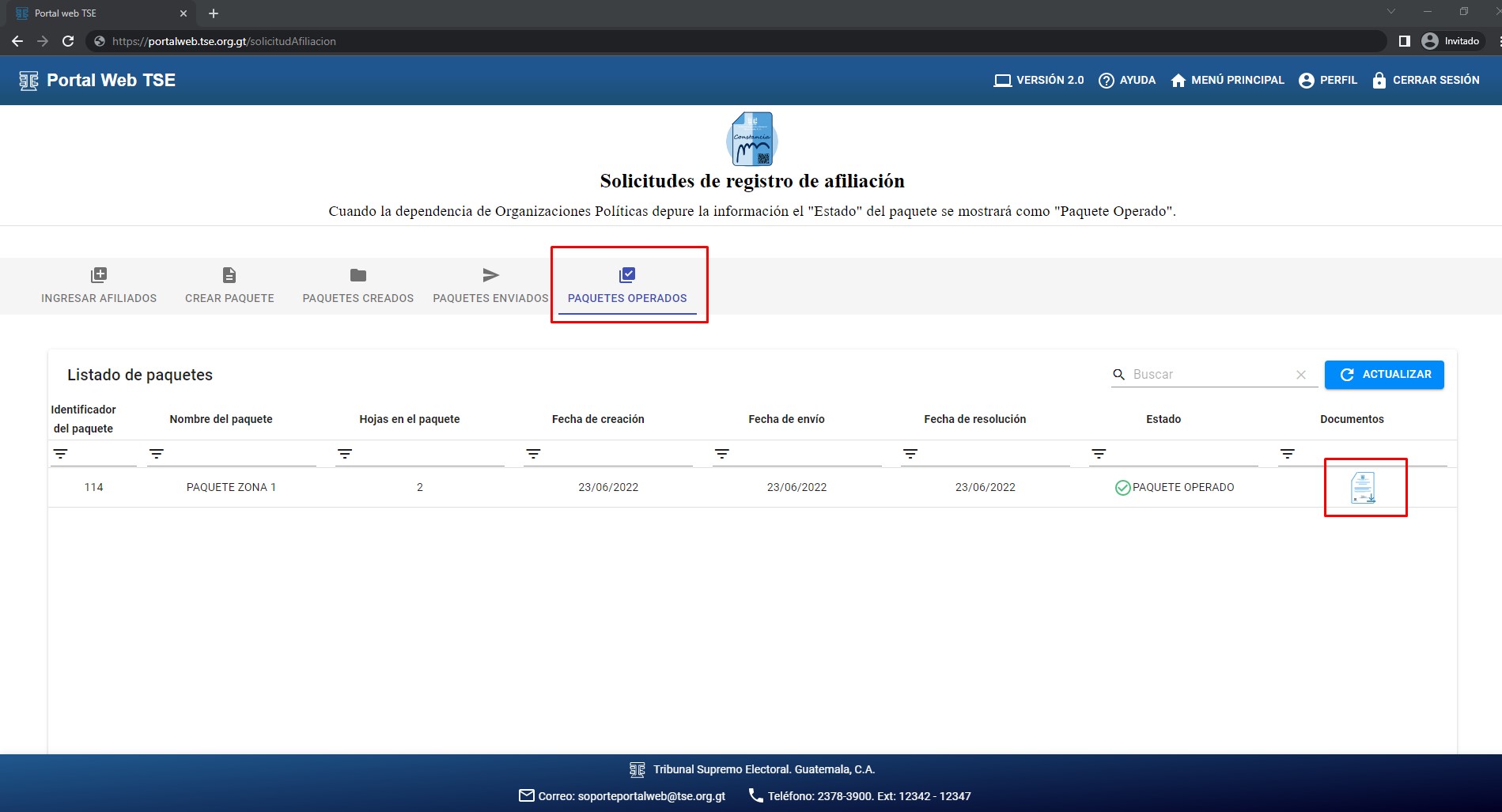 Cuando el paquete haya sido enviado de forma física y se depure en las oficinas del Departamento de Organizaciones Políticas, se visualizara en la pestaña “PAQUETES OPERADOS” todos los paquetes que ya se hayan depurado, al mismo tiempo pueden descargar el documento con el “Resumen de la depuración”.