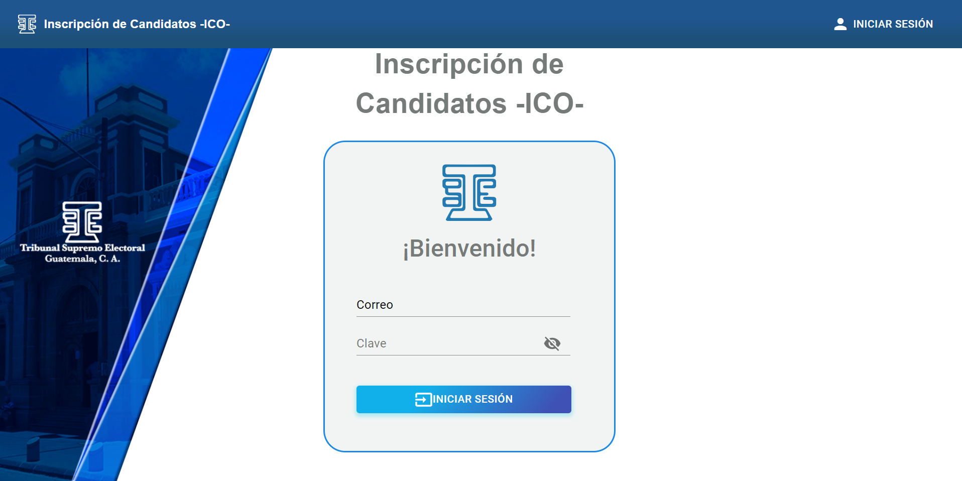 Para ingresar al sistema Portal Web ICO TSE deberá abrir su navegador (Chrome de preferencia) y escribir la siguiente dirección “https://inscripciondecandidatos2023.tse.org.gt/login” al cargar la página se mostrará la pantalla en donde deberá ingresar las credenciales.