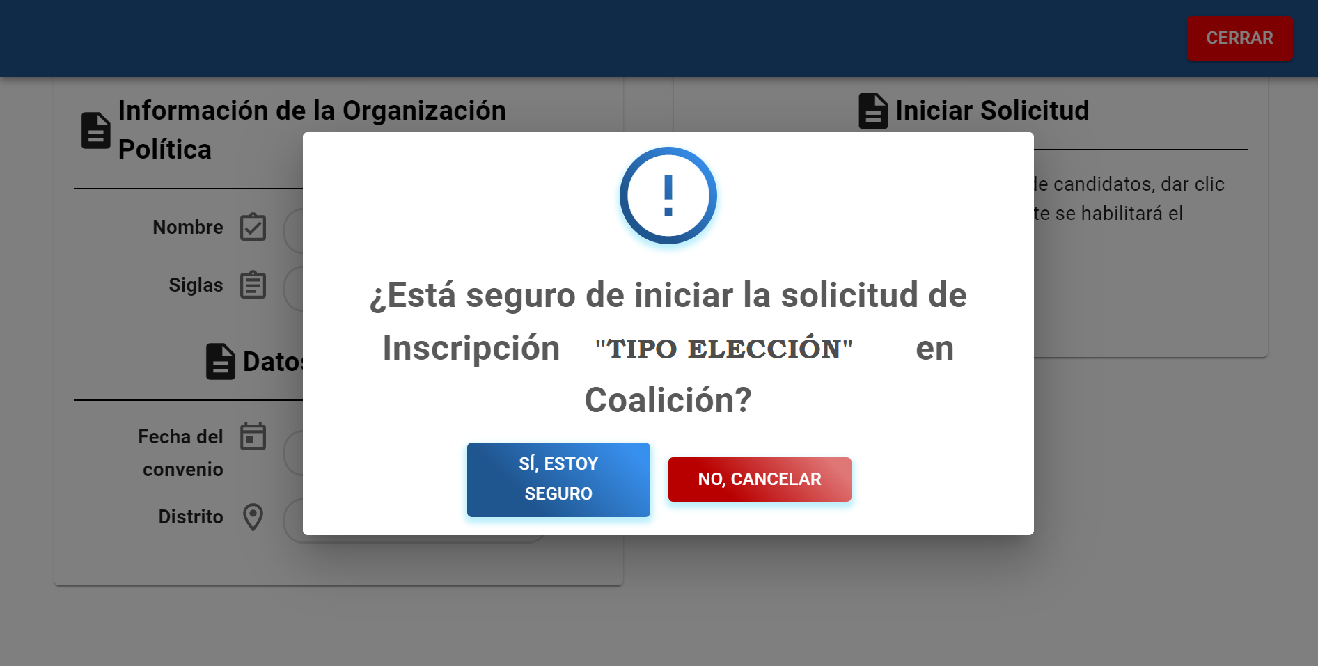 B). Al dar clic al botón “INICIAR SOLICITUD”, se desplegará una alerta para confirmar que está seguro de INICIAR la solicitud.