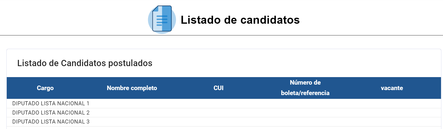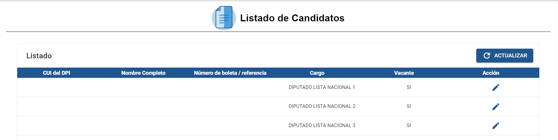 En la parte de abajo de la pantalla del ingreso de la planilla de candidatos, encontrará el listado de los candidatos ingresados.