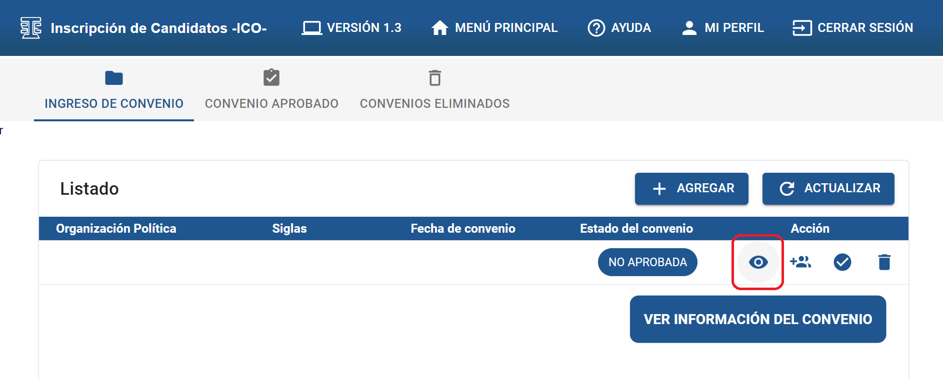 Al dar clic en la sección “INGRESO DE CONVENIO” encontrará un botón “VER INFORMACIÓN DEL CONVENIO”.