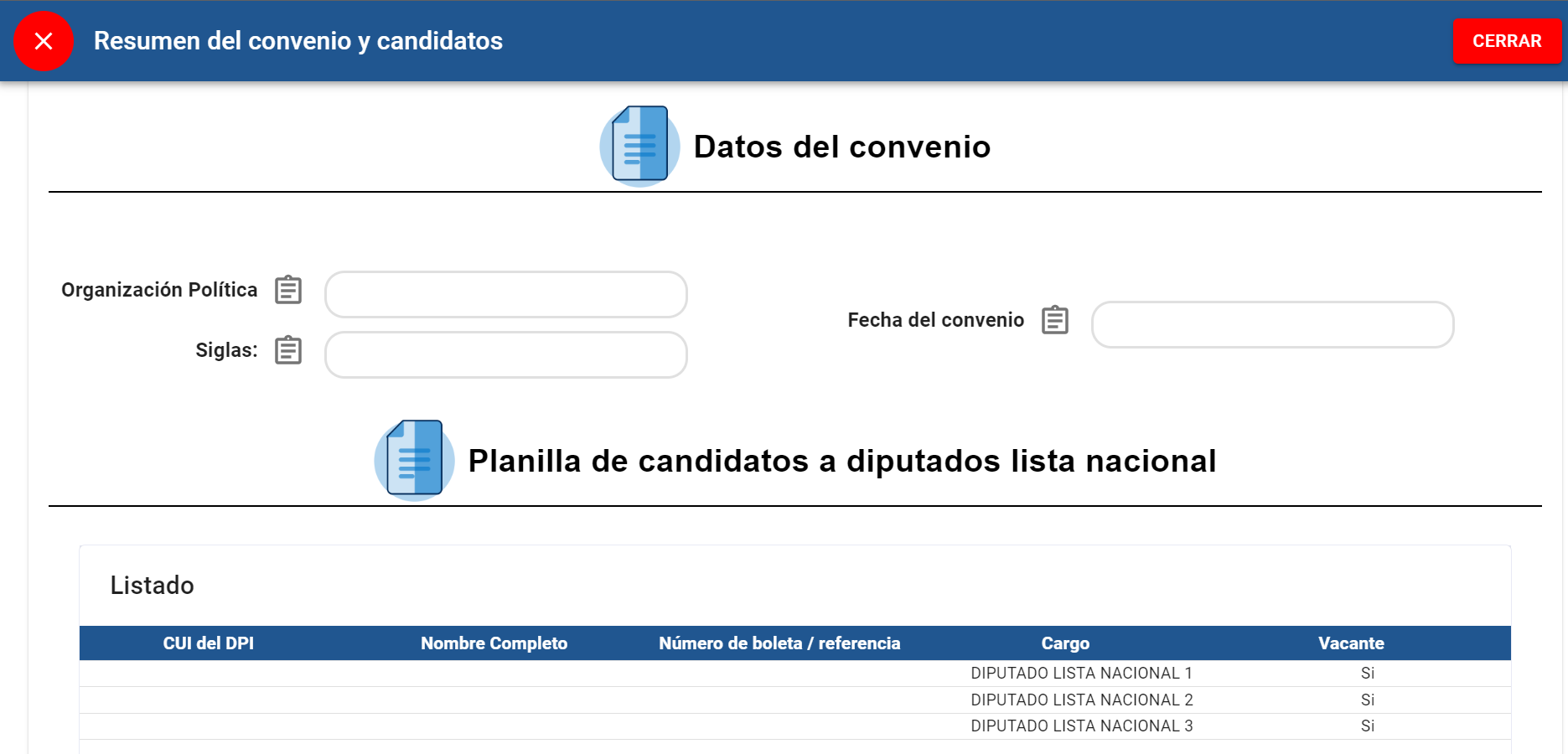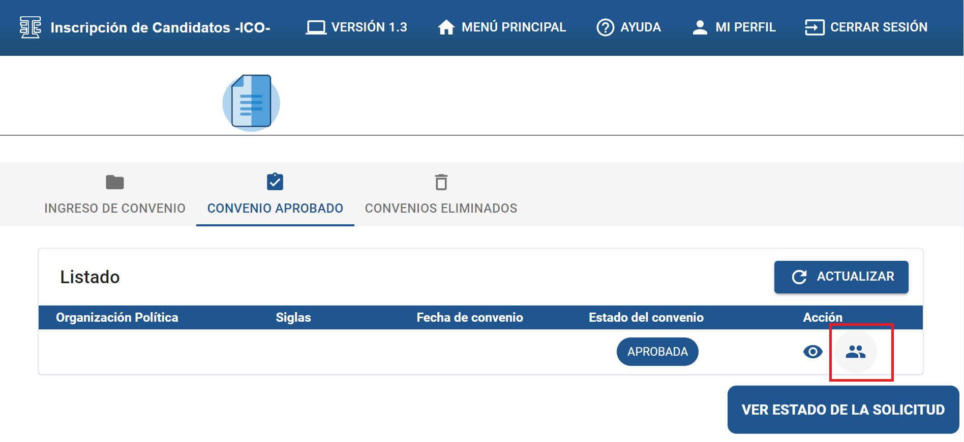 B) Pantalla que se visualizará al ingresar a la opción “VER ESTADO DE LA SOLICITUD”, en ella se encontrará la información del partido político y datos del convenio, donde se postularon a los candidatos para el puesto anteriormente descrito.