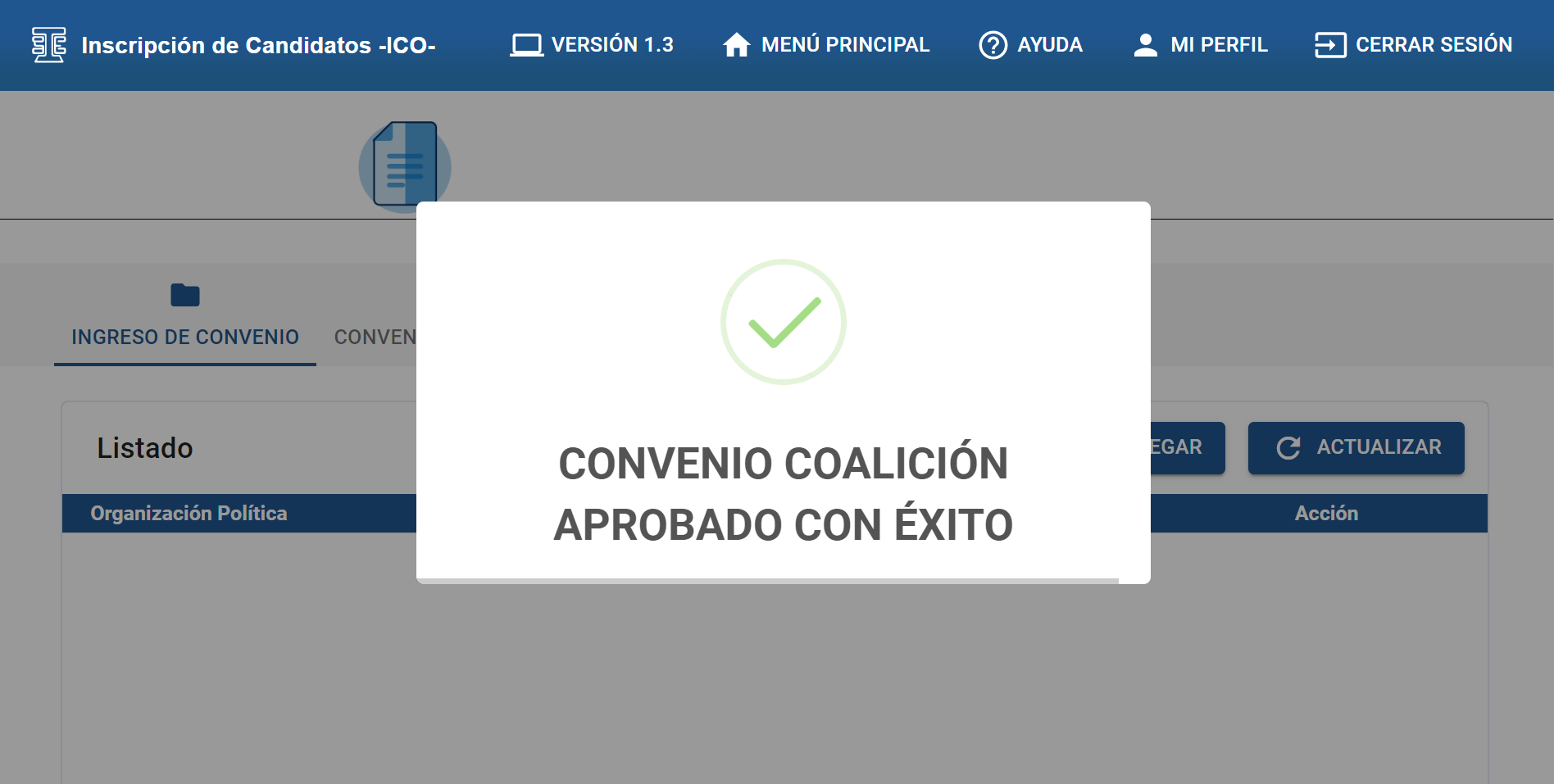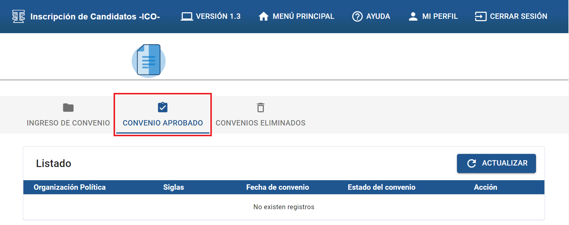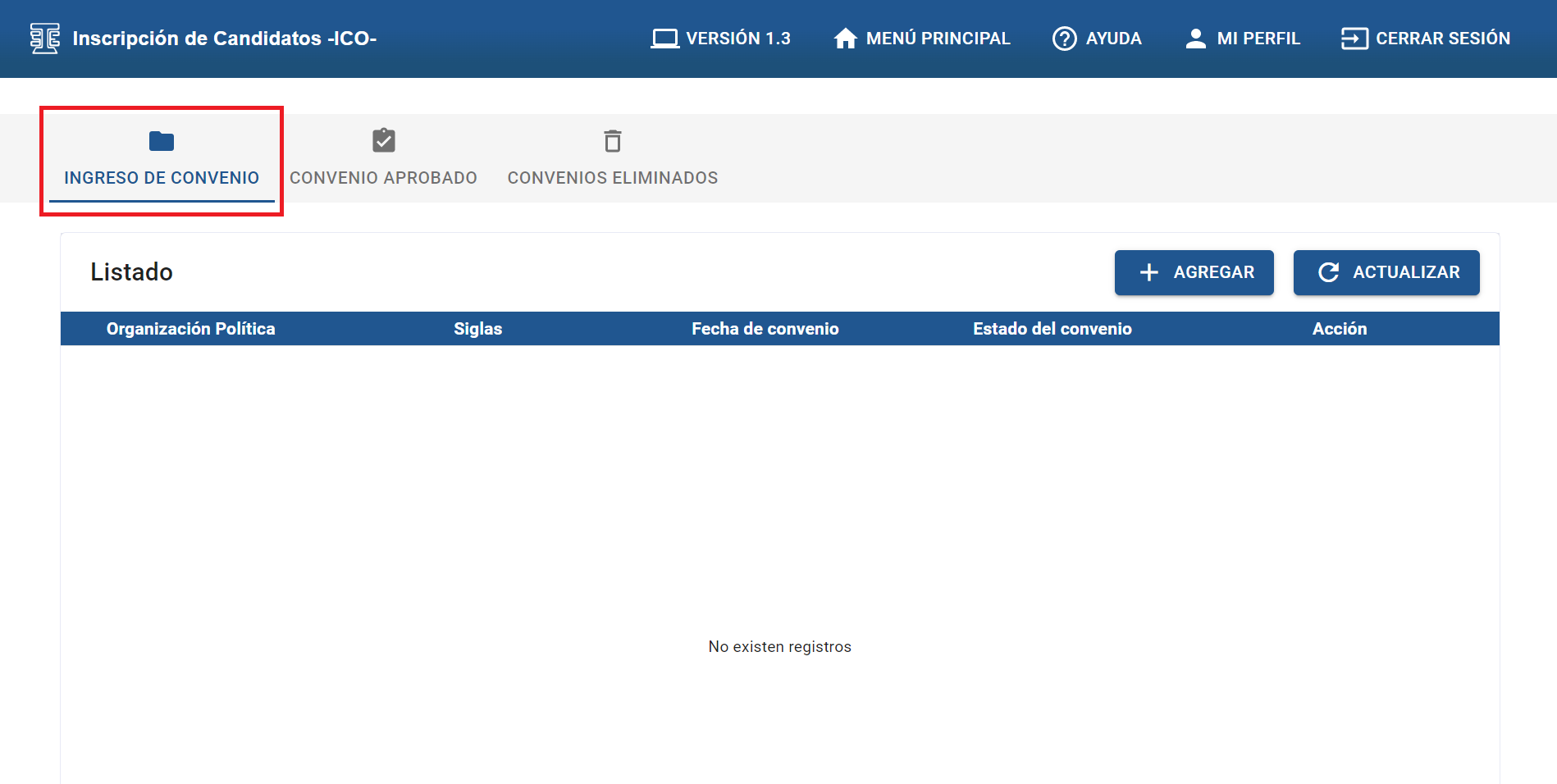 Al dar clic en la sección “INGRESO DE CONVENIO” encontrará el listado de los convenios.
