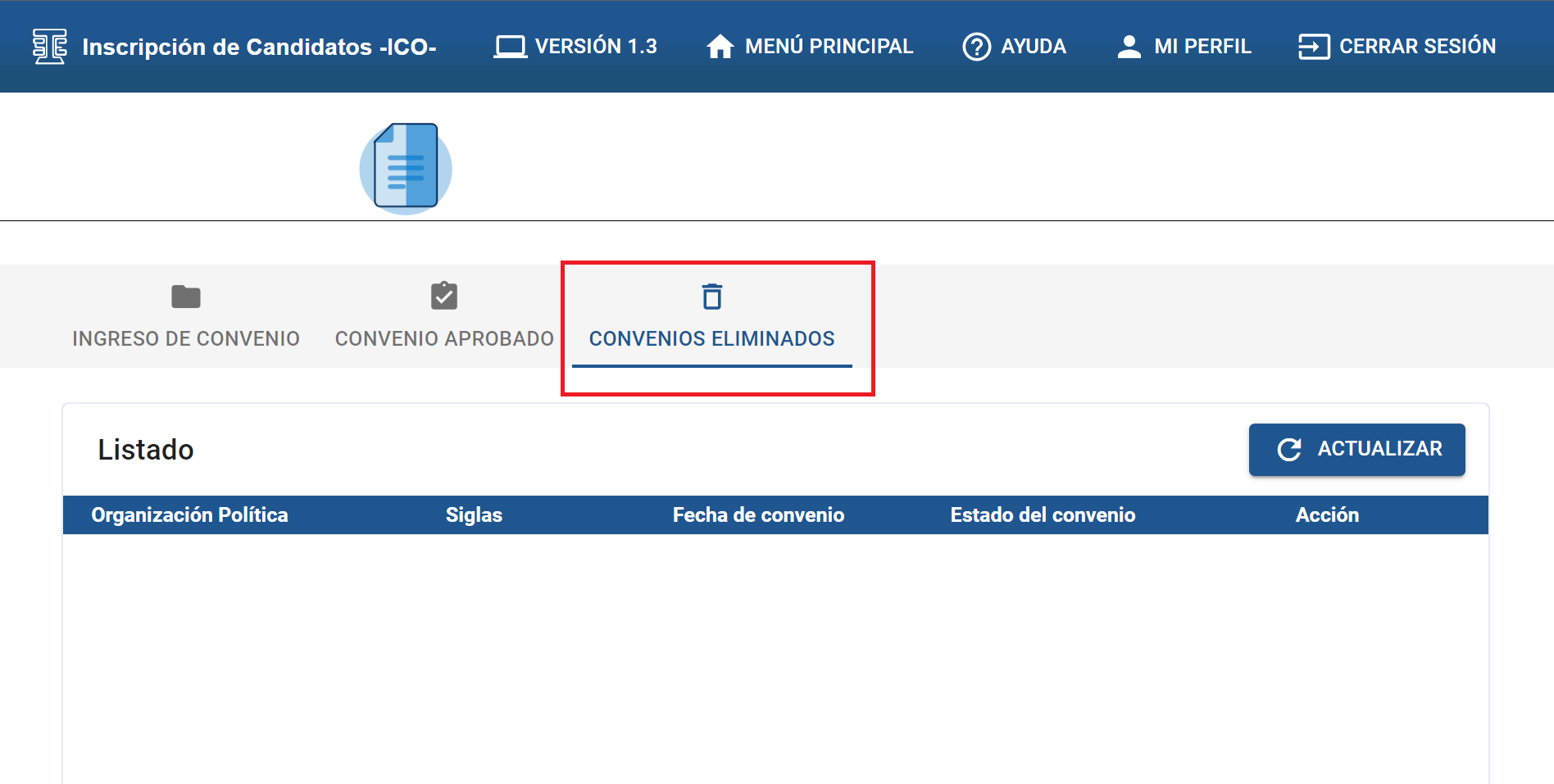 Al dar clic en la sección “CONVENIOS ELIMINADOS” encontrará el listado de los convenios eliminados.