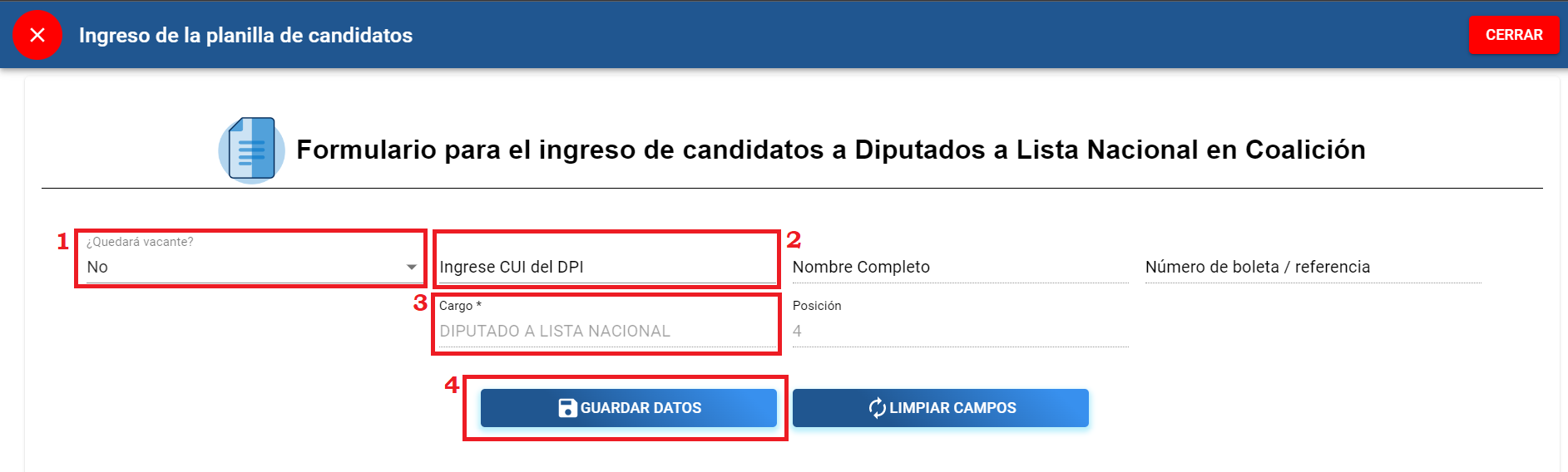 4. Presionar el botón “GUARDAR DATOS”. Realizar los mismos pasos de este inciso para ingresar otro candidato.