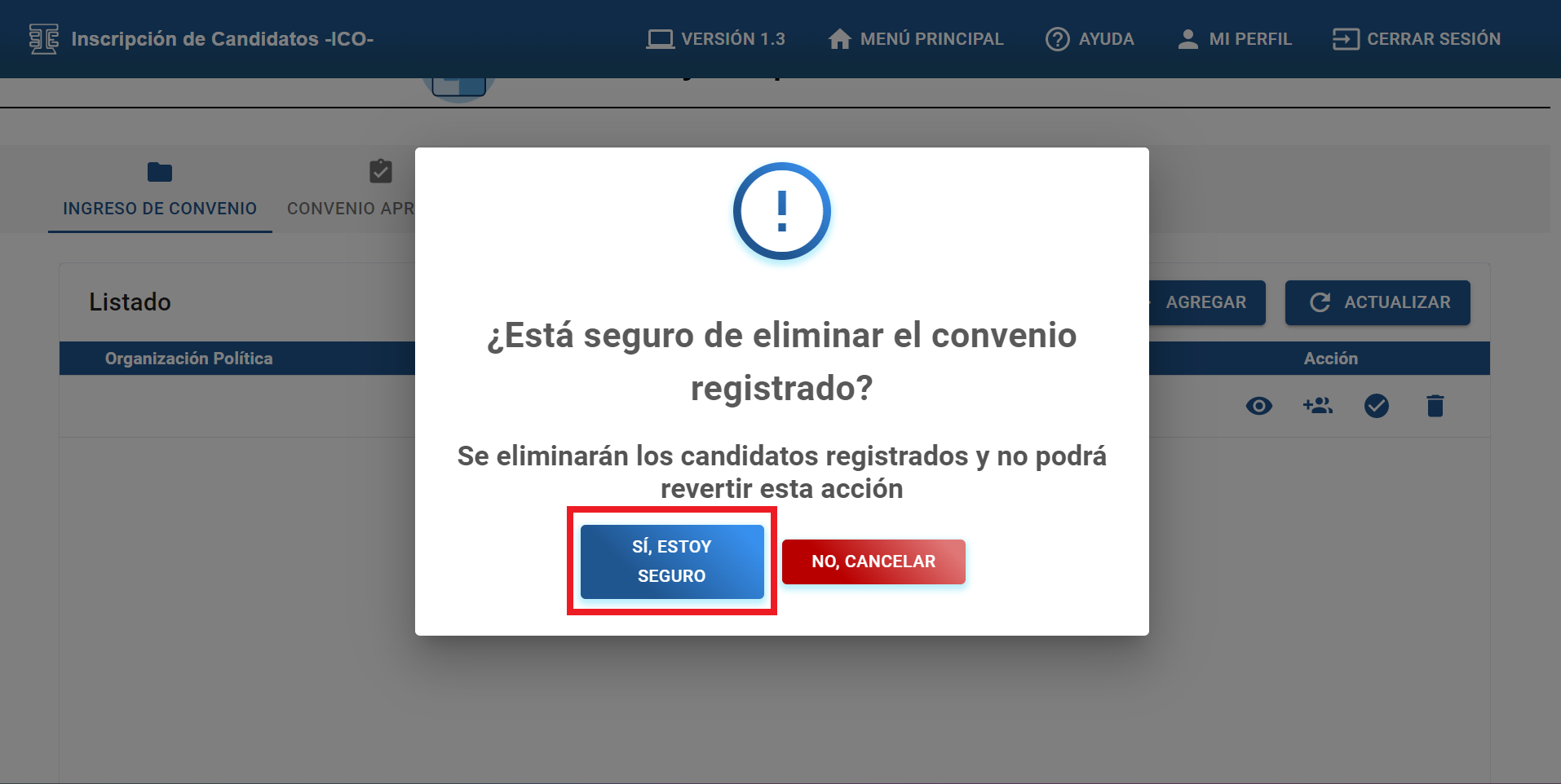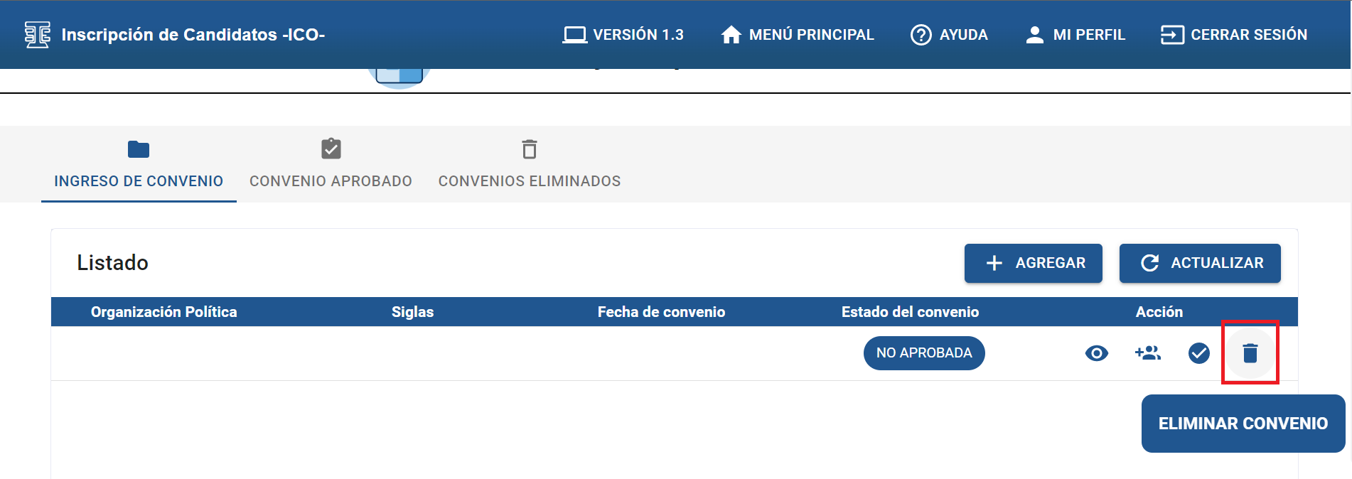 Debe dar clic sobre el botón “ELIMINAR CONVENIO”.