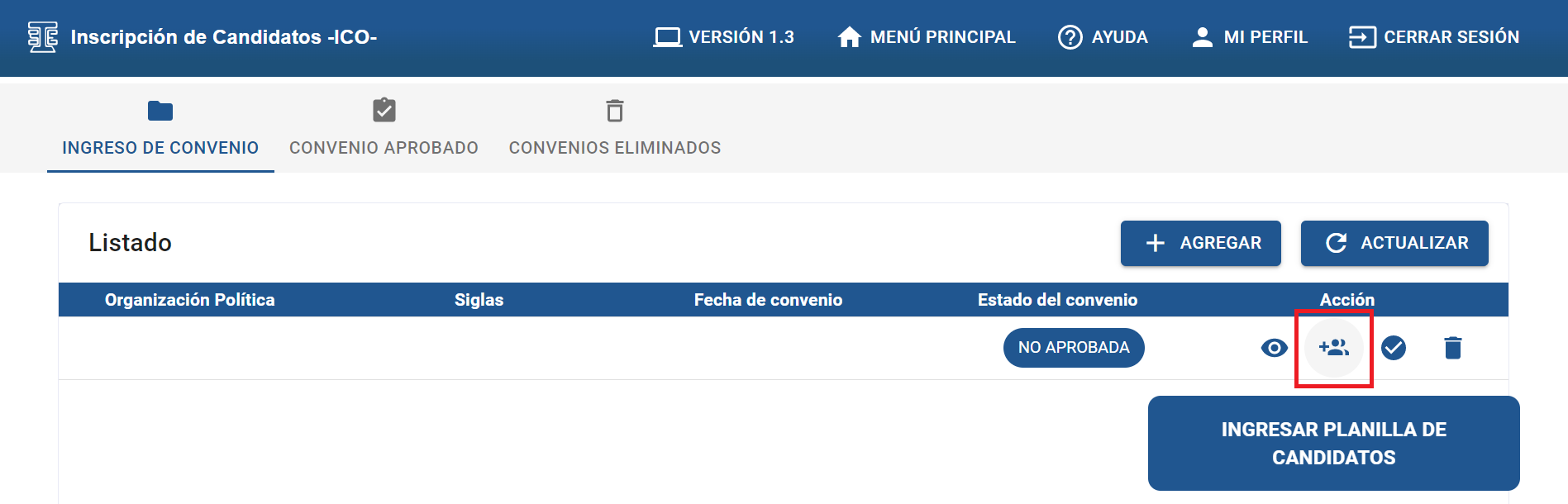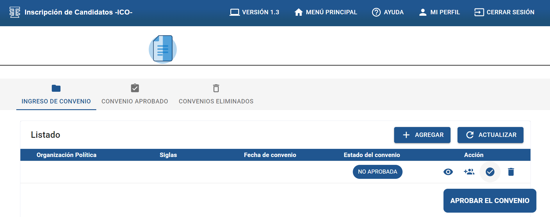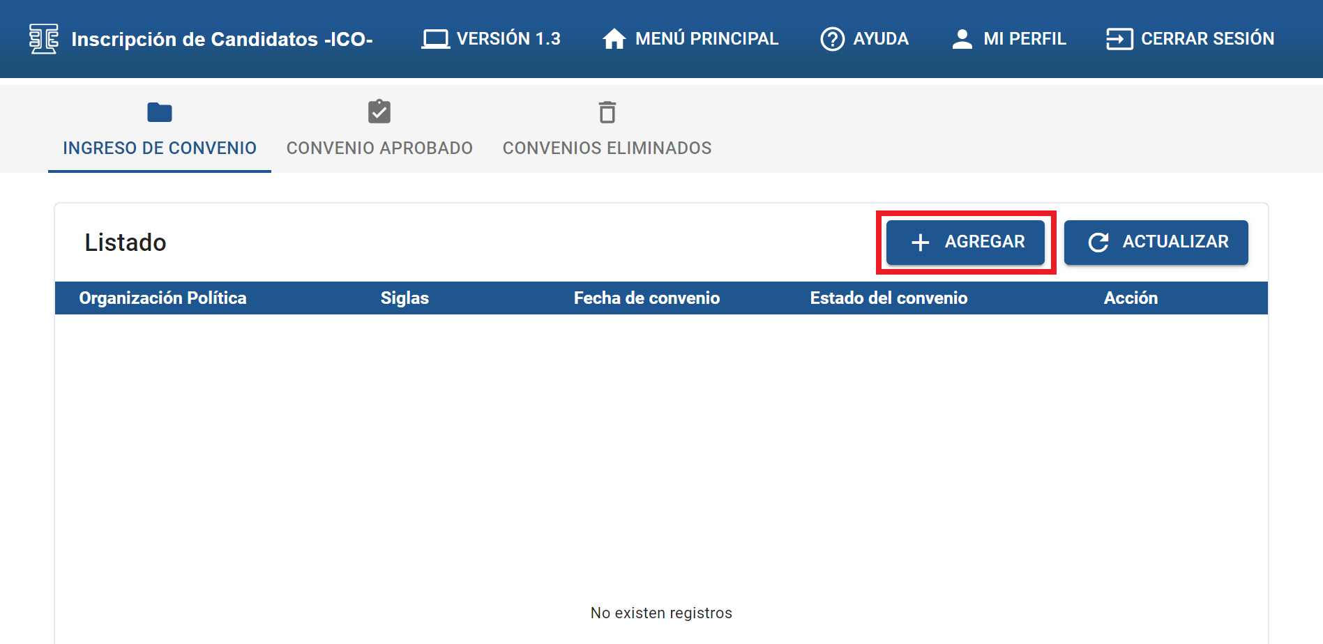 Debe dar clic sobre el botón “AGREGAR”, para crear un nuevo convenio.