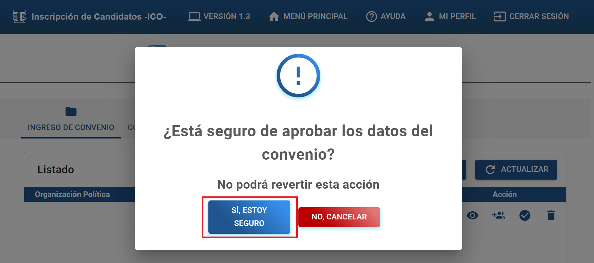 B) Al dar clic al botón “APROBAR CONVENIO”, se desplegará una alerta para confirmar que está seguro de APROBAR la “el convenio de diputados lista nacional en coalición ”. Al momento de aprobar ya no podrá editar o eliminar, deberá de estar seguro de la información ingresada.