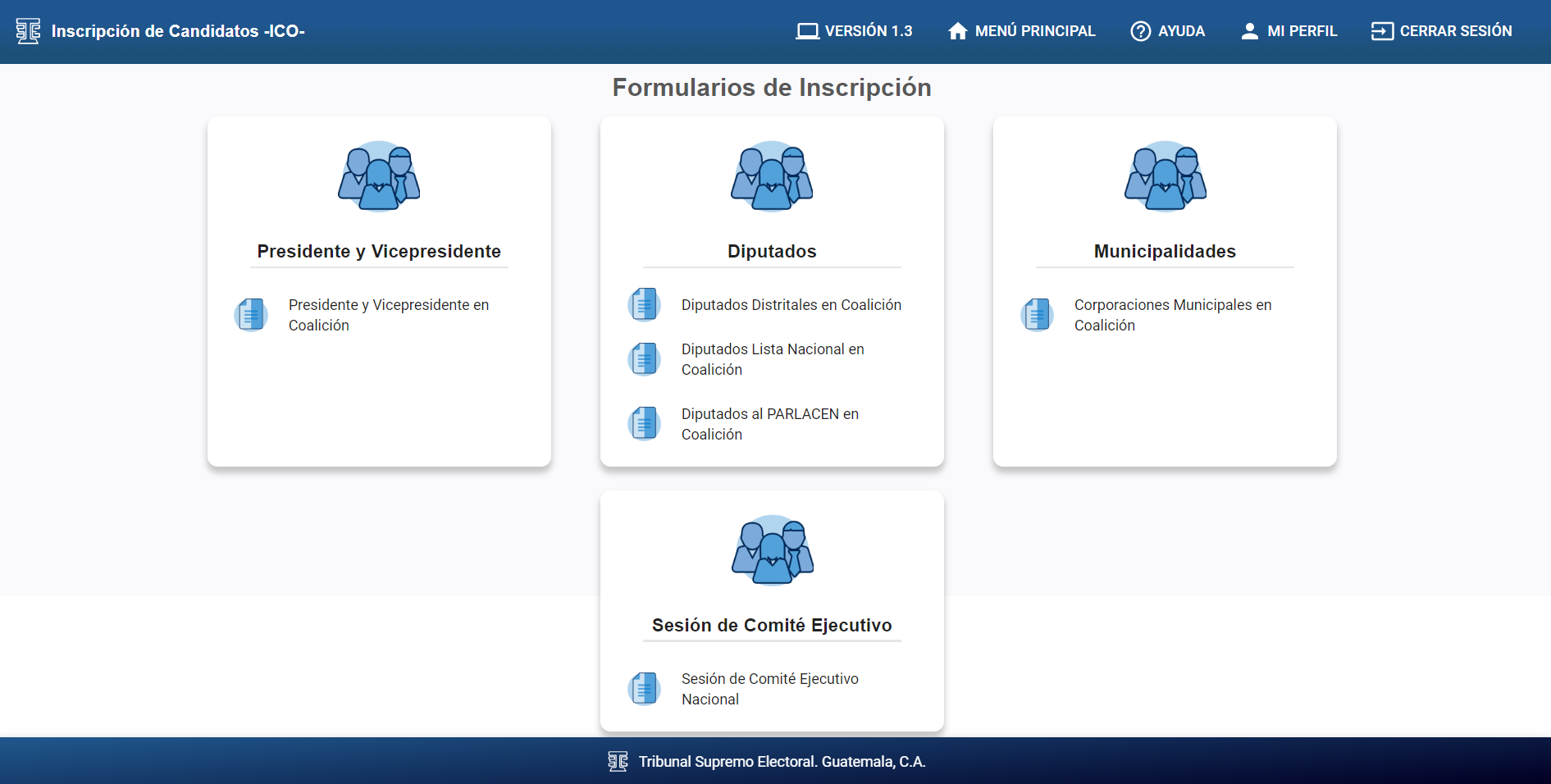 Pantalla principal que se tendrá al ingresar al sistema Portal Web ICO TSE, en ella tendrá acceso a los módulos correspondientes.