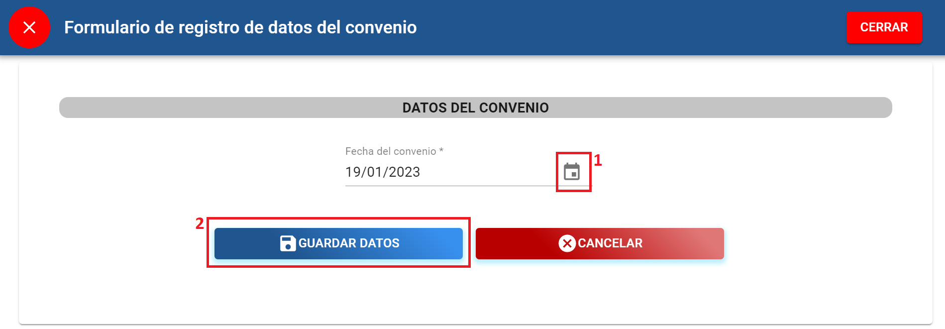 1. Dar clic para desplegar un calendario para seleccionar la fecha del convenio