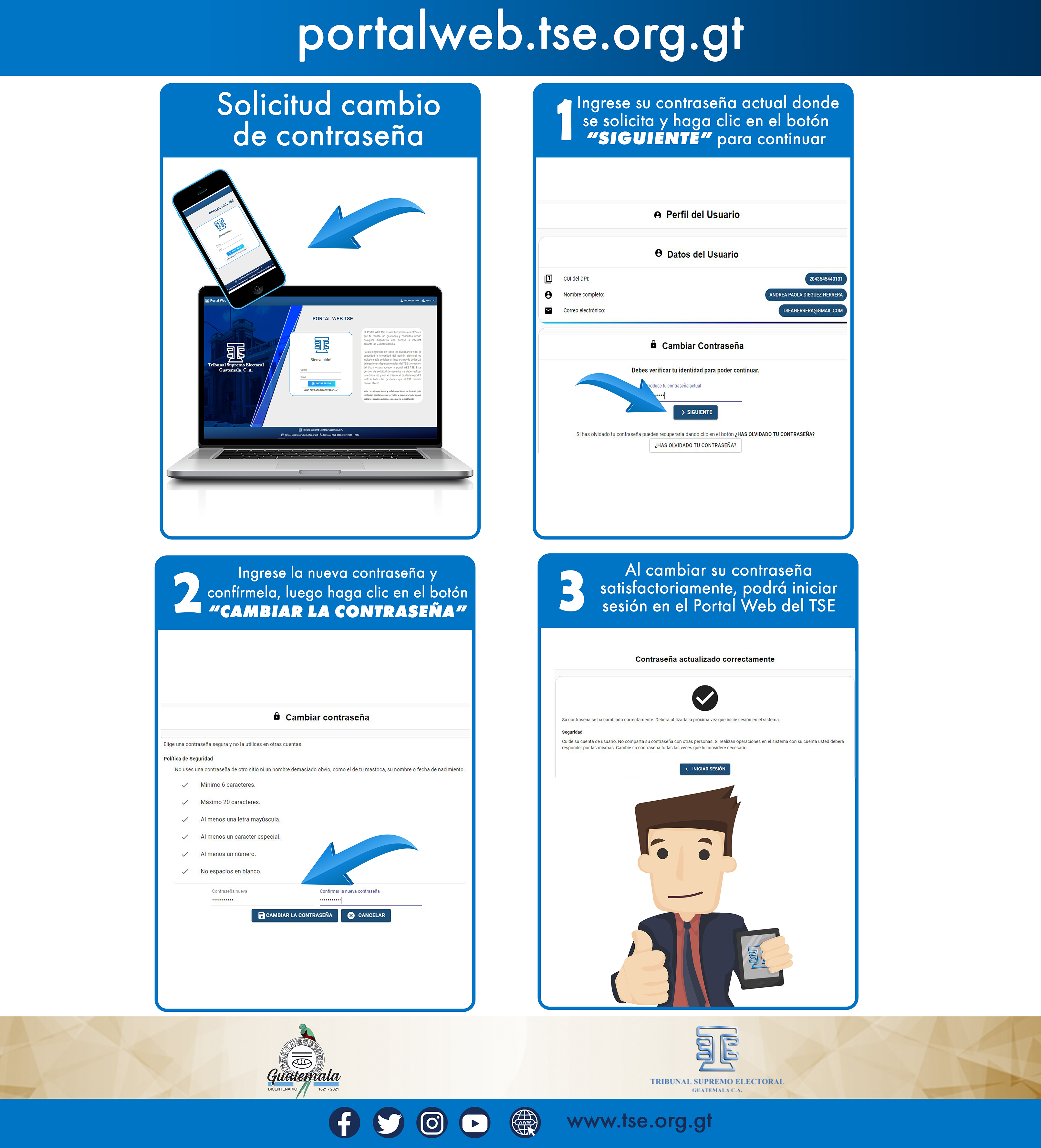 El manual para “Cambio de contraseña”, describe de manera detallada el proceso por el cual los ciudadanos o representantes de partidos políticos podrán cambiar la contraseña para acceder al Portal Web del Tribunal Supremo Electoral.