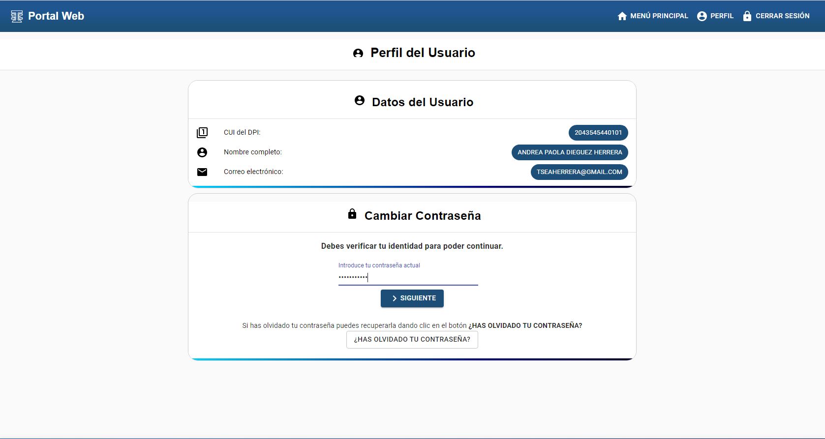 Desde la opción “PERFIL”, también podrá cambiar o recuperar su contraseña, ingrese su contraseña actual donde se solicita y haga clic en el botón “SIGUIENTE” para continuar.