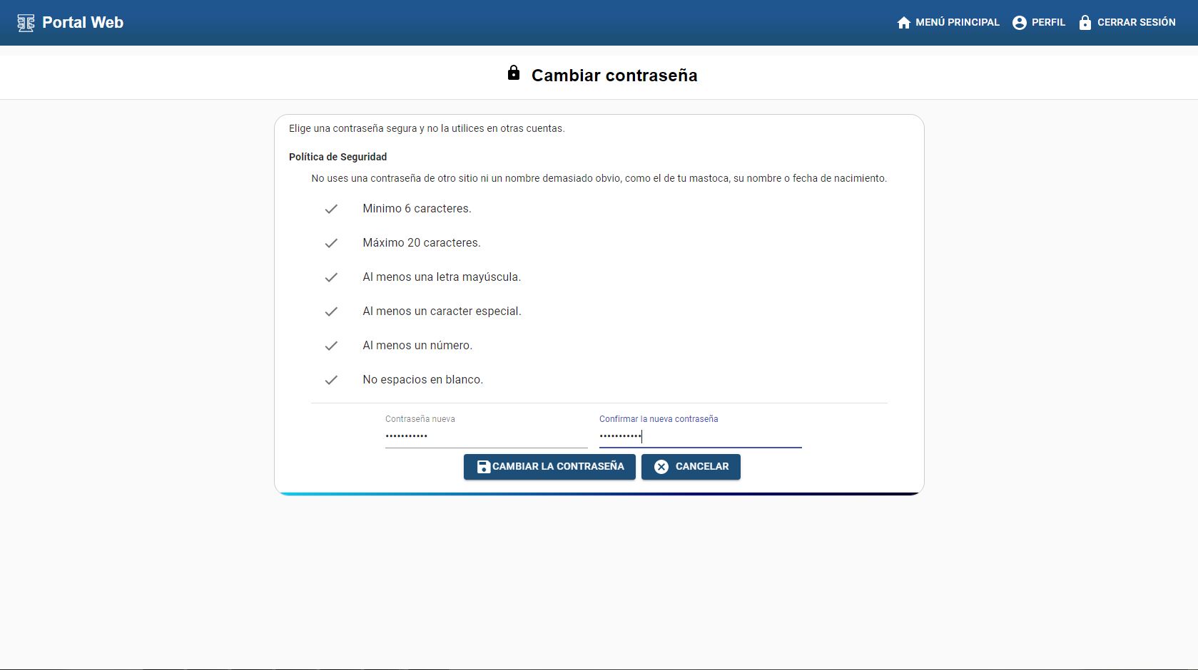 Ingrese la nueva contraseña y confírmela, luego haga clic en el botón “CAMBIAR LA CONTRASEÑA