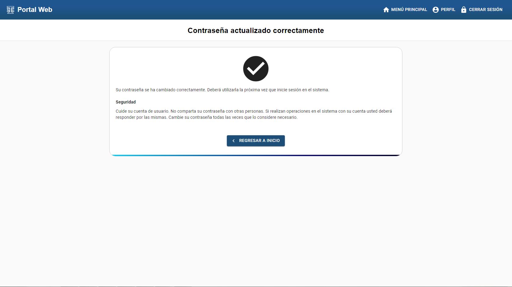 Al cambiar su contraseña satisfactoriamente, la podrá utilizar para iniciar sesión en el Portal Web del TSE. Haga clic izquierdo en el botón “REGRESAR A INICIO” para realizar la gestión que desee, en caso contrario cierre sesión haciendo clic izquierdo en la opción “CERRAR SESIÓN”.